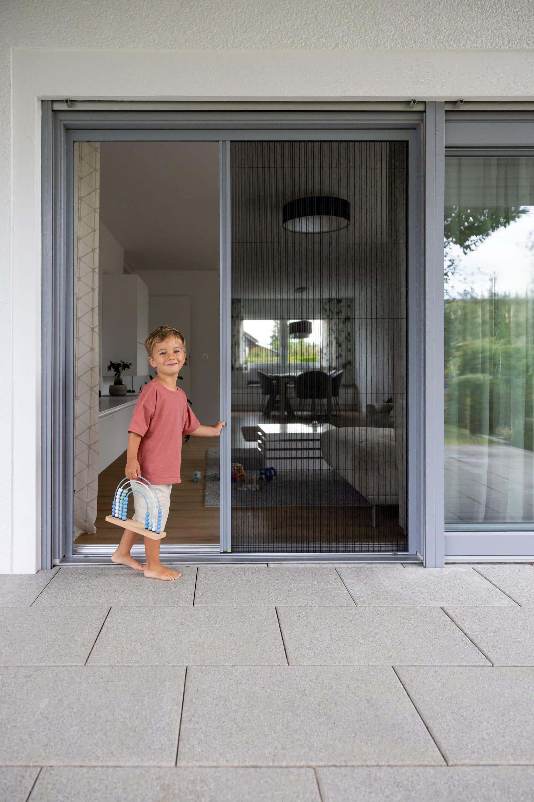 Fliegengitter-Plissee-Türe mit zusammengebautem Montagerahmen | von vorne schraubbar