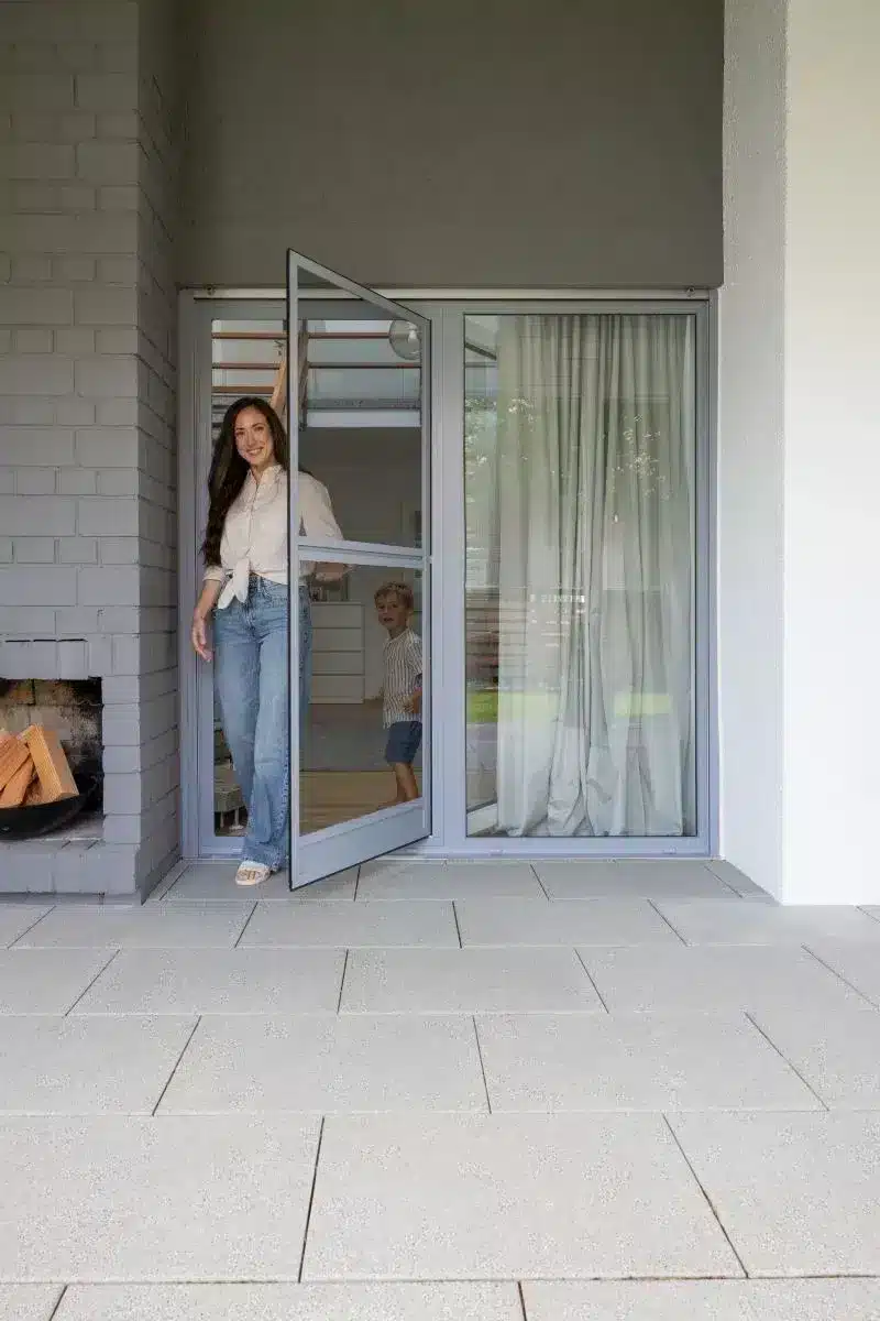 Fliegengittertür für Stulp Türen, flächenbündig oder versetzt. Öffnet innen & außen, mit geschlossenem Montagerahmen unten und seitlicher Rahmentrennung.